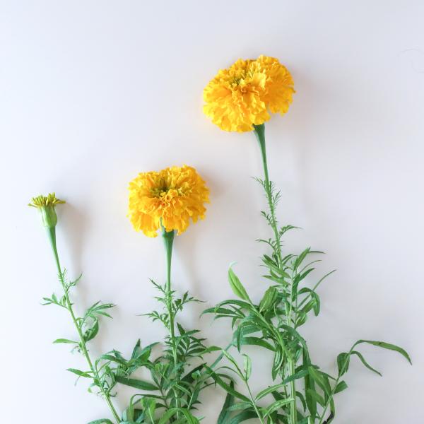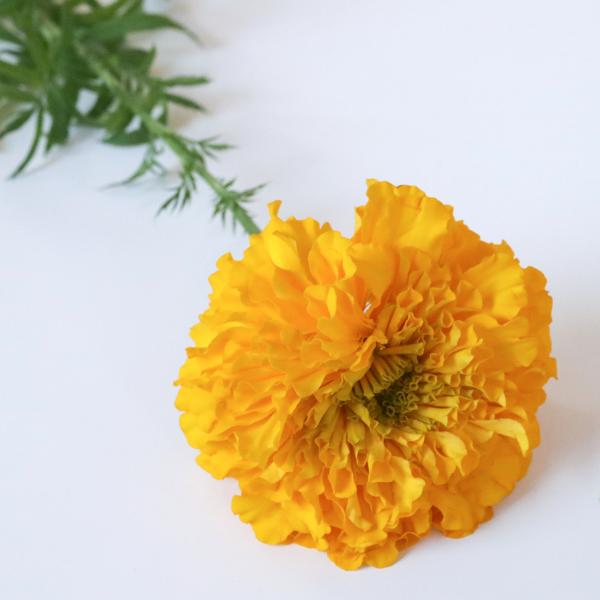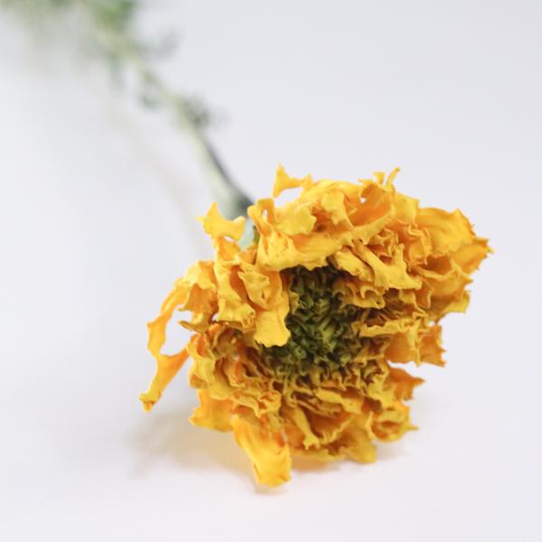 柔らかい花びらが幾重にも重なっているマリーゴールドはドライフラワーにしても素朴な華やかさがあります。