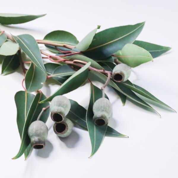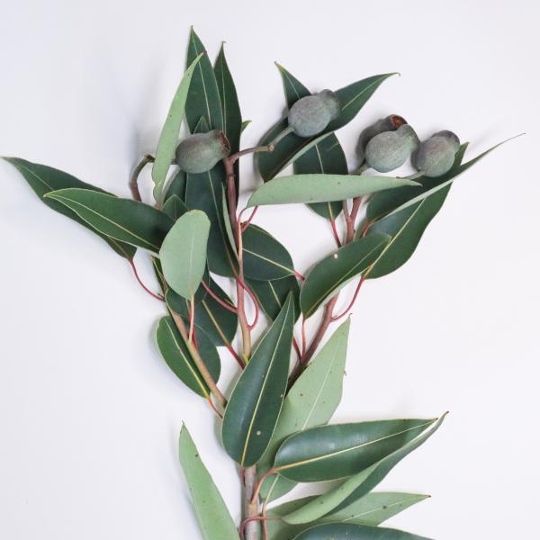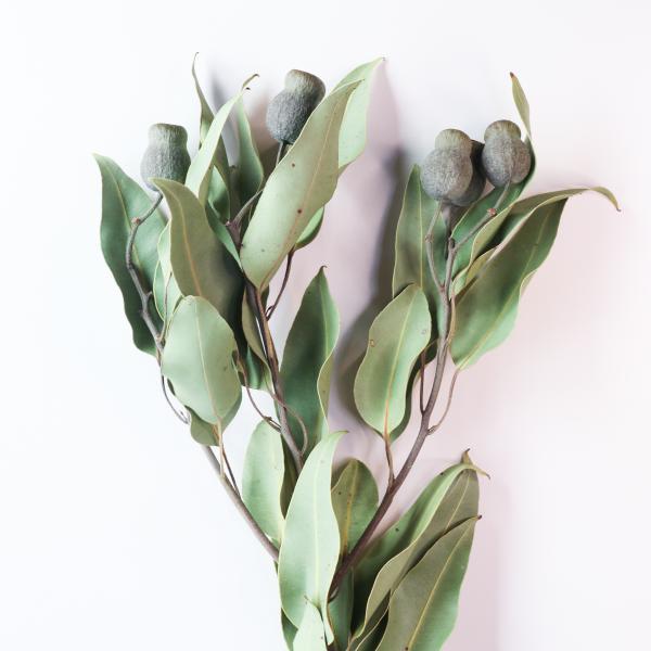 ユーカリ・ベルガムナッツやユーカリ・トランペットなどと呼ばれる品種です(現在のところ正式名・学名は不明。わかる方、教えてください)。