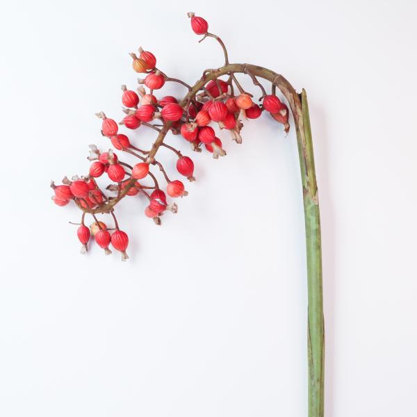 月桃の実は緑色で、熟すと鮮やかな朱色に変化します。ドライフラワーにする場合は朱色になってから乾かすと、途中で実が弾けてよりユニークな形を楽しめます。