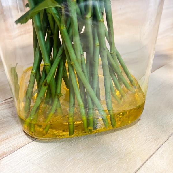 こちらの液に生花の状態で12時間ほど挿しておくだけでお花の染色ができるんです。